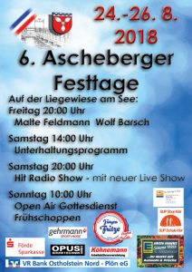 (CIS-intern) – Ascheberg feiert wieder das große Dorffest direkt am Großen Plöner See. Drei Tage lang wird das Gelände rund um Liegewiese, Seglerhafen und Campingplatz zur Festmeile mit Spiel und Spaß für Klein und Groß, Jung und Alt. Schnuppersegeln, Stand-Up Paddling, Aussichtsfahrten in 30 Meter Höhe und ein buntes Unterhaltungsprogramm auf der VR Bank-Bühne – einige der Highlights der 6. Ascheberger Festtage 2018.