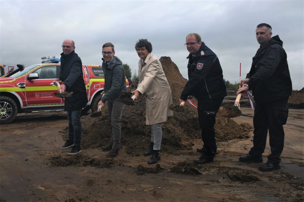 Offizieller Spatenstich für ZFB-Neubau (v. l.): Bernd Paliga-Könneke (stuhk architektur GmbH), Landrat Thorben Schütt, Kreispräsidentin Ute Borwieck-Dethlefs, Kreiswehrführer Martin Dreßler und Ulf Zimmermann, Vorsitzender des Bau-, Planungs- und Wirtschaftsausschusses der Gemeinde Hemmingstedt sowie 2. stellvertretender Bürgermeister der Standortgemeinde.
